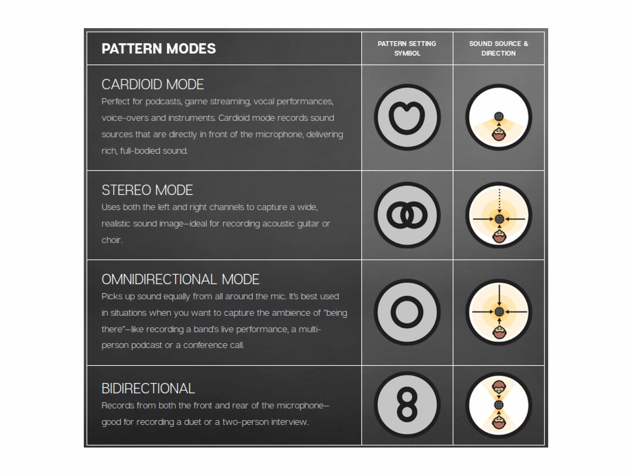 Polar Patterns: Cardioid, Bidirectional, Omnidirectional, Stereo